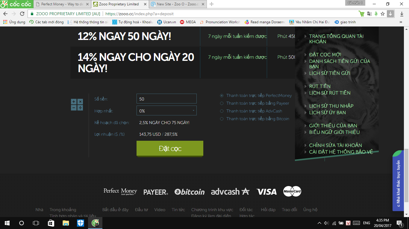 thanks bác..dep tiền vào vậy là xong phải không..e ref theo bác chủ thớt không biết được rcb koChỗ đó là "Compounding ( Lãi kép )": là tỷ lệ % số tiền lãi hàng ngày sẽ tự động tái đầu tư vào site nếu bạn muốn, nếu bạn chọn tái đầu tư lại thì chỉ nên chọn từ 50% trở xuống, khi nào hoàn vốn có thể chọn cao hơn hoặc chọn 0% để mau hoàn vốn cho an toàn trước rồi tái đầu tư sau![]()